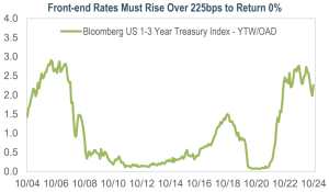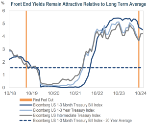 Source: Bloomberg as of 11/7/24 unless stated otherwise. Top chart: First Fed Cut refers to the date of the first cut in that respective cutting cycle. The 20-year average for the Bloomberg 1-3 Month Treasury Bill Index is from 10/31/04 to 10/31/24. The views contained in this report are those of Income Research + Management (“IR+M”) and are based on information obtained by IR+M from sources that are believed to be reliable, but IR+M makes no guarantee as to the accuracy or completeness of the underlying third-party data used to form IR+M’s views and opinions. As of: 10/31/24. Sources: Bloomberg and IR+M Analytics.