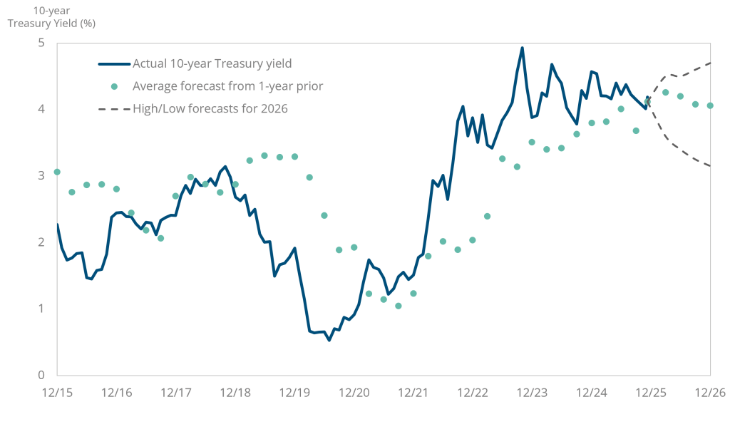 One forecast in particular — interest rates — remains notoriously difficult to predict. Early calls show a wide range: the 10-year Treasury could finish 2026 anywhere between 3.15% and 4.70%.