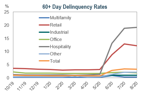 - However, peeling back the onion, the performance deterioration has not been homogenous across all property types as headlines might suggest. The hospitality and retail sectors have shown the largest stress cracks with 60+ day delinquency rates surpassing 19% and 12%, respectively.