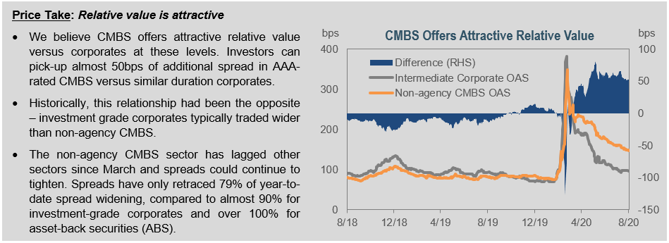 - In sympathy with the rest of the investment-grade market, CMBS spreads reached their widest levels in over 9 years back in March. The Bloomberg Barclays Non-Agency CMBS Index started the year trading below 100bps, but quickly widened to almost 365bps. Spreads eventually retraced much of the spread widening and settled closer to 150bps, as market action via TALF 2.0 helped calm investor fears and supported spreads.