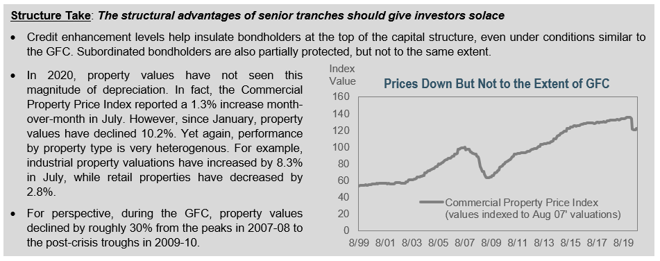 - The majority of CMBS trusts originated post-GFC have included senior tranches that are structured with a minimum subordination of 30%. This protection is in addition to the underlying borrower’s equity, which exists outside of the trusts, and it absorbs any losses prior to bondholders in a property liquidation scenario. Additionally, the amount of credit enhancement for senior tranches can also increase over time as principal payments are made.