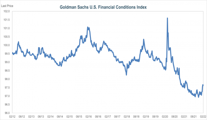 Powell’s real goal is to tighten financial conditions. These conditions are dictated by capital markets and serve as the gas to fuel economic growth (and inflation). The trick is to tighten that gas valve just enough to keep the economy cooking, but not overheating. Based on The Goldman Sachs Financial Conditions Index (GSFCI; Figure 2), he still has quite a few tightening turns to go for conditions to return to long-term averages. Yet Powell has already laid out the tightening plans, leaving the FOMC with limited additional conventional tools to counteract the possibility that inflation continues to spiral higher. In that case, his best bet may be to further amplify his hawkish rhetoric by suggesting that unconventional tools, such as active bond sales, are being considered. This threat – an immediate “duration” supply shock – would likely shift both short and long-term interest rates, along with broad financial conditions, meaningfully higher.
