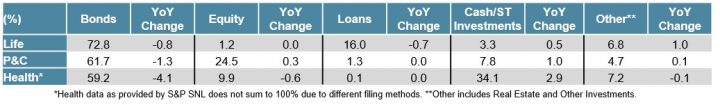 - Overall asset allocation moves within insurance company investment portfolios were small and primarily around the edges. Within P&C, equity allocations ended the year at their highest levels ever, while bonds were at their lowest.