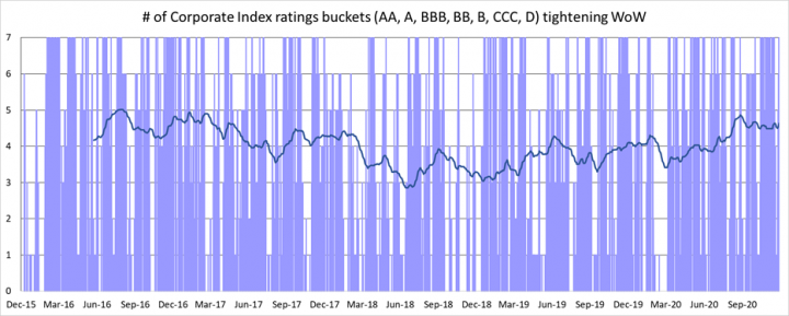 Other metrics tell the same story. A means to gauge the strength of corporate bond activity is to track the number of industries that tighten together (market breadth; Figure 4) and the number of ratings buckets that tighten together (market depth; Figure 5). Notice how these “herding” metrics bottom-out in 2018 but have gradually risen over the past couple of years. It seems that the dealer community has met these regulatory challenges with new business models that will once again provide broad and deep liquidity for the foreseeable future.