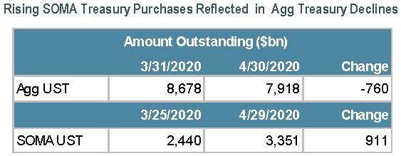 - From March to April, the Fed ramped up its Treasury purchases, which peaked at $75 billion per day. The SOMA purchases increased from $358 billion to $727 billion, which effectively made these securities index ineligible. As a result, the Agg’s permissible Treasury holdings experienced the largest monthly decline since the index’s inception, with the market value falling approximately 2.5%.