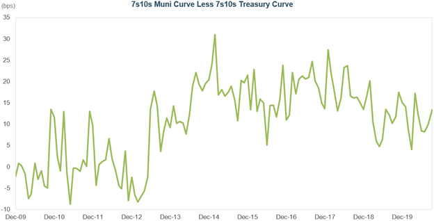 With our Crossover strategy, we look at the relative steepness of various yield and credit curves. We compare the Treasury curve to the Aaa Municipal curve, and also consider corporate and securitized curves on an after-tax basis. After analyzing these relationships, we then position portfolios accordingly. Given the Municipal curve mostly takes its cues from the shape of the Treasury curve, the real driving differential between the shapes therein are unique demand dynamics. When one part waxes and the other part wanes, opportunity is created. In other words, the differential is purely technical, not fundamental. One of our favorite topics is comparing the 7s10s Muni curve with its Treasury curve counterpart. Unless you believe there is incremental credit or liquidity risk in the Muni market as you extend slightly from 7 to 10 years, this part of the curve should closely mirror that of the Treasury curve. Since it rarely does, opportunity and relative value exist.