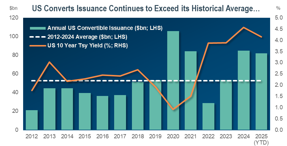 - Convertibles: Something has shifted. A market transformed. After an impressive 2025, the convertibles renaissance is fully underway. The market continues to deliver competitive relative performance, strong liquidity, and record-setting issuance. Its broader investor base – hedge funds – has returned, helping restore market depth. We expect this momentum to persist in 2026, due in part to cost advantages for issuers over traditional debt in this non-zero rate environment. AI is also a factor in this market, bringing opportunity and volatility as high-growth issuers increasingly use converts to fund their capital needs. We believe that converts have real staying power – a power they have not had for years.