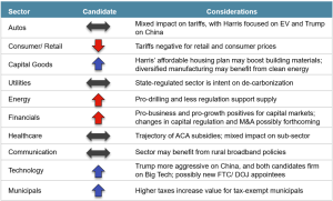 - Anti-trust – enforcement changes could be on the horizon. With Federal Trade Commission (FTC) Chair Lina Kahn working on an expired contract, a new regime could be forthcoming for anti-trust enforcement. The Biden administration has long been focused on anti-trust issues, which have discouraged M&A activity, particularly in the technology sector. Harris has demonstrated some resistance to mergers in the past, but her California roots now have her courting business and tech leaders. Historically, the Republican party has been more hands-off regarding regulation. Also, Republicans have not embraced the technology industry due to the sector’s stance on free speech and censorship.