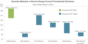 - Spreads are generally unfazed by political party. Dating back to 2000, in the three months surrounding a presidential election, investment-grade corporate spreads typically move within a narrow range. The exception was in 2008, which was excluded from this chart because of the extreme spread volatility caused by the Great Financial Crisis.