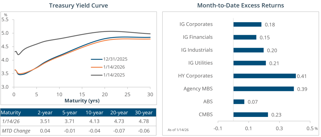 Sources: Bloomberg and Bloomberg Index Services Limited. All commentary and data as of 1/15/26 unless otherwise noted. Excess returns are the curve-adjusted excess return of a given index relative to a term structure-matched position in Treasuries. The views contained in this report are those of IR+M and are based on information obtained by IR+M from sources that are believed to be reliable but IR+M makes no guarantee as to the accuracy or completeness of the underlying third-party data used to form IR+M’s views and opinions. This report is for informational purposes only and is not intended to provide specific advice, recommendations, or projected returns for any particular IR+M product. No part of this material may be reproduced in any form, or referred to in any other publication, without express written permission from Income Research + Management. “Bloomberg®” and Bloomberg Indices are service marks of Bloomberg Finance L.P. and its affiliates, including Bloomberg Index Services Limited (“BISL”), the administrator of the index (collectively, “Bloomberg”) and have been licensed for use for certain purposes by IR+M. Bloomberg is not affiliated with IR+M, and Bloomberg does not approve, endorse, review, or recommend the products described herein. Bloomberg does not guarantee the timeliness, accurateness, or completeness of any data or information relating to any IR+M product.