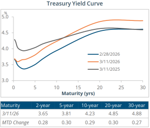 - February’s CPI report rose 0.2% month-over-month and 2.4% on an annualized basis – the slowest pace since 2021 – though consumers remain concerned about potential inflationary pressures from higher energy prices stemming from the conflict in Iran